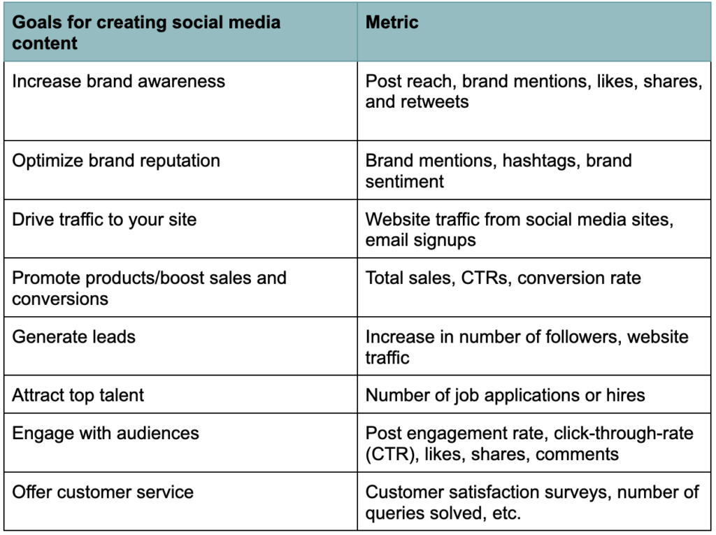 While boosting engagement may be the primary goal for creating social media content, you’ll need to go granular when defining your goals. And tie each goal to a specific social media metric that you can track.