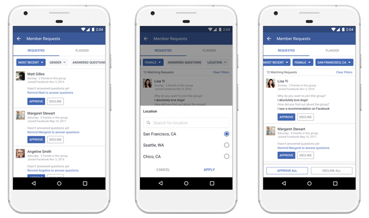 Membership request filtering: We also hear from admins that admitting new members is one of the most time-consuming things they do. So, we added a way for them to sort and filter membership requests on common categories like gender and location, and then accept or decline all at once.